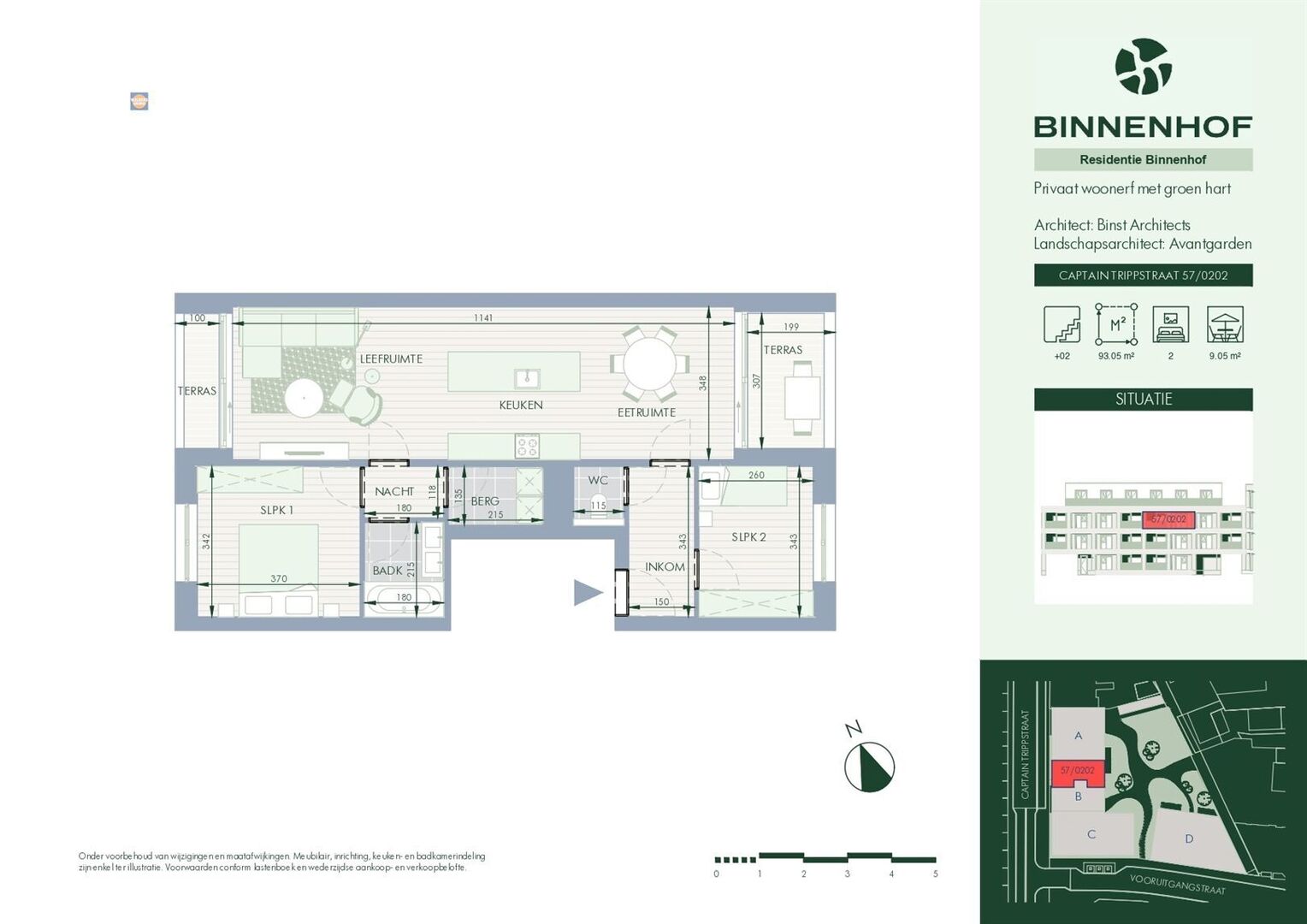 Dit appartement op de tweede verdieping beschikt over een open leefruimte met keuken, twee slaapkamers, badkamer, berging en apart toilet. De twee terrassen vormen een aangenaam verlengstuk van de leefruimte.