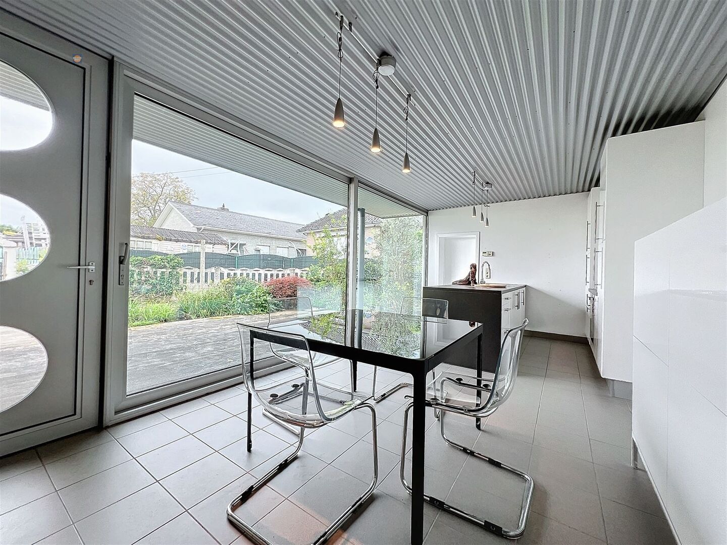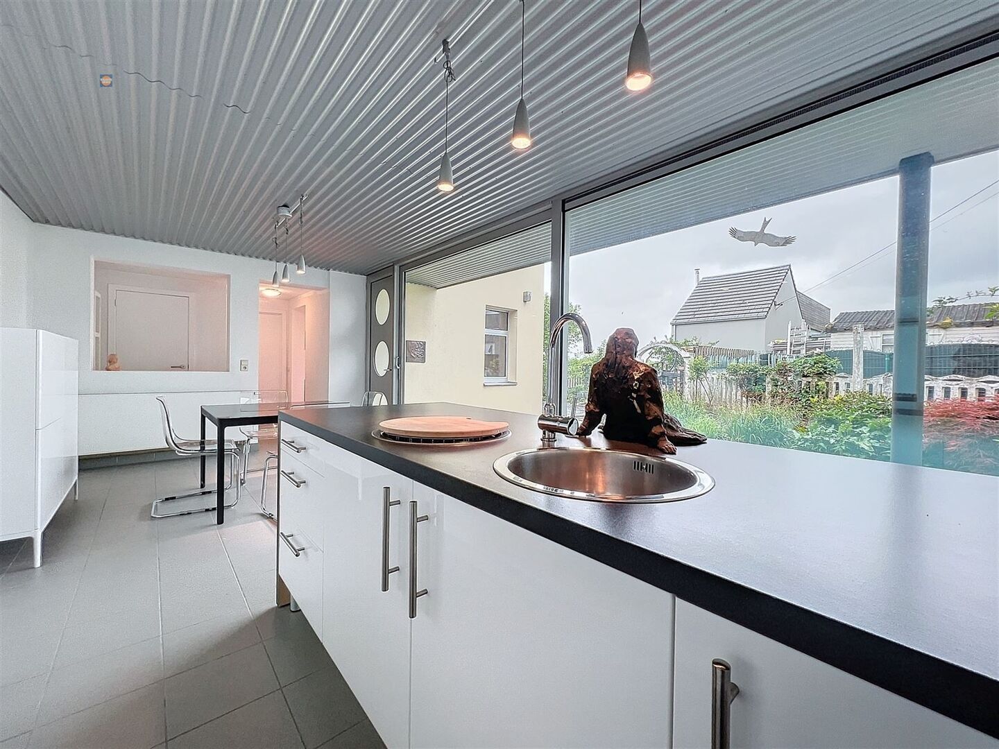 Deze woning heeft op het gelijkvloers een mooie keuken inclusief eetkamer met zicht op het terras, een knusse woonkamer